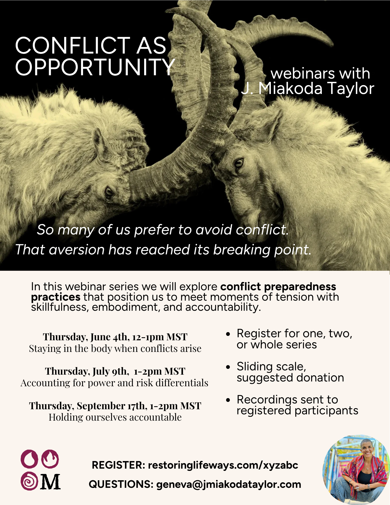 In each of these stand alone offerings we will explore a different set of conflict preparedness practices, positioning each of us to meet the moments of tension that arise in our relationships with skillfulness, embodiment, and accountability while centering a commitment to transformative justice.