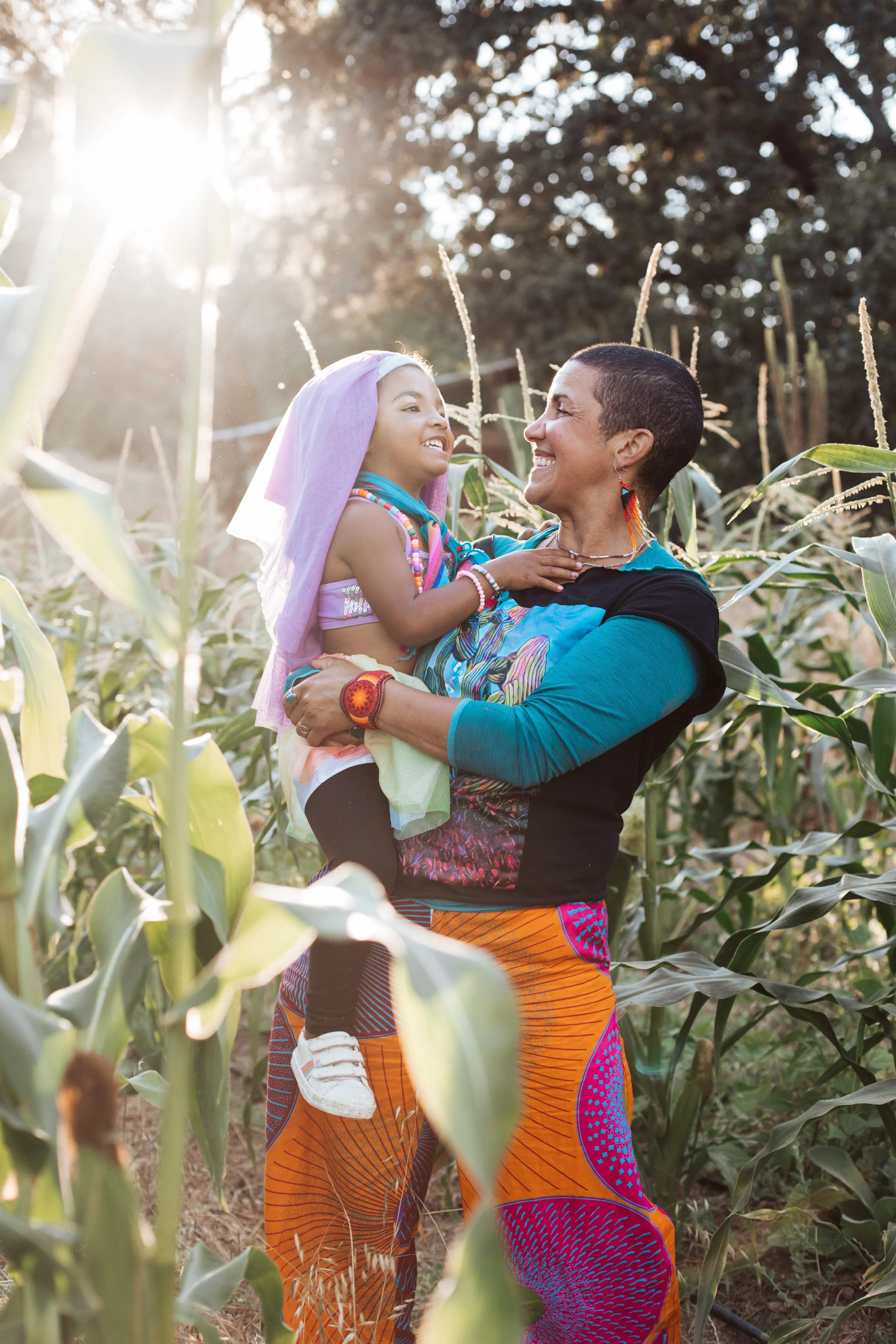 Miakoda holding their child Ezelle, in a corn field with sunlight shining through.